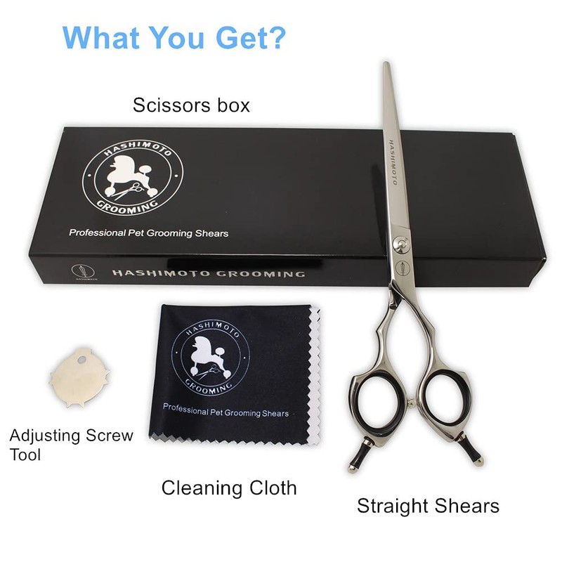 What you get: HASHIMOTO straight dog scissors, scissor package, cleaning cloth, adjustment tool.
