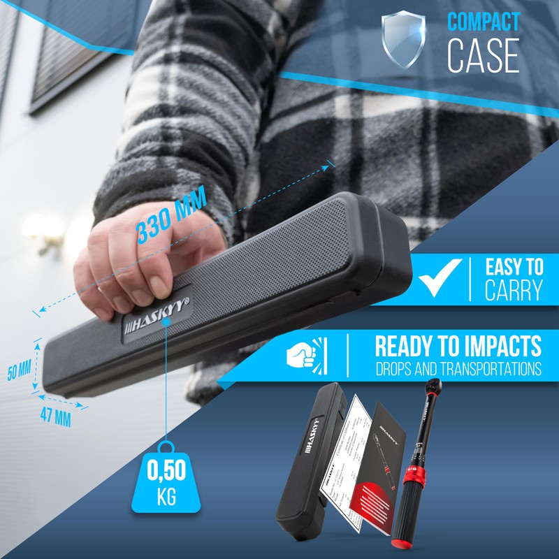 The HASKYY 1/4 inch torque wrench 10-50 Nm comes in a practical storage box that not only protects the key, but also facilitates transport and storage. In addition, the set often also includes various sockets in different sizes to make the wrench versatile.