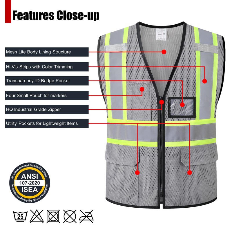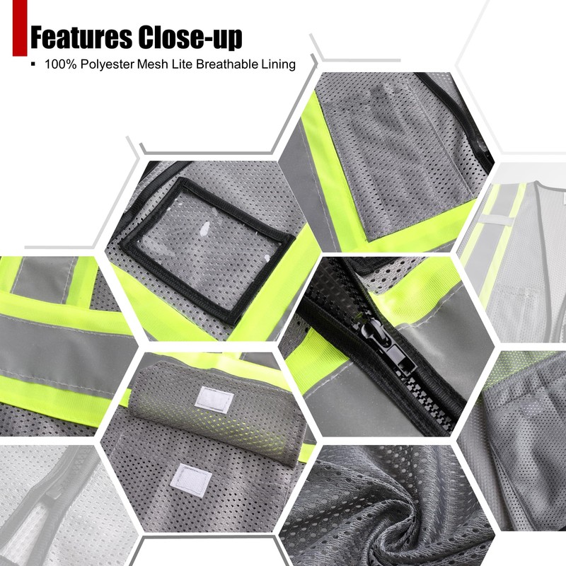 • FEATURES: Grey mesh safety vest unisex design with two vertical and one horizontal 2-inches wide Retro-Reflective strips with contrasting trim enhance visibility from all angel,covering chest,back and both shoulders. Hi vis vest for men will provide a 360¡ã Retro-Reflective light wave while in day time or night time with any light sources.High vis vest enable you to be seen during the day and at night in a variety of environments, helping ensure your safety.