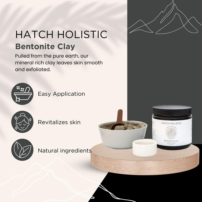 - Purifying & Rejuvenating Clay – Hatch Holistic Bentonite Clay pulls impurities from deep within the skin, promoting a fresh, radiant complexion while leaving skin smooth and exfoliated. Ideal for all skin types, including sensitive skin.