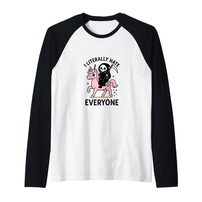 Hate Everyone Grim Reaper Shirt Funny Pink Unicorn Sarcastic Raglan Baseball Tee
