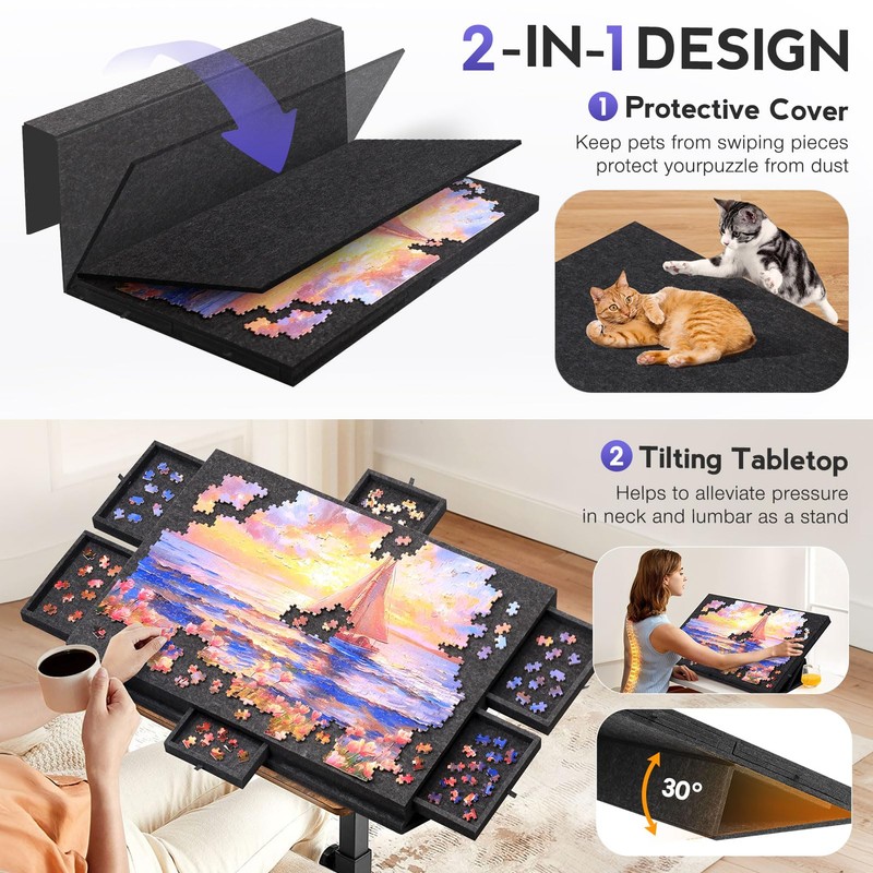 - 6 Drawers & Protective Cover: The puzzle board with drawers is 37.7x25.5 inches, Holds up to puzzles for adults 1500 pieces. The puzzle tables for adults with 6 sliding drawers sort your pieces, keep them categorized while assembling your puzzle. Every drawer is feature with handle, that easy to open when using, keep the puzzle pieces safe.