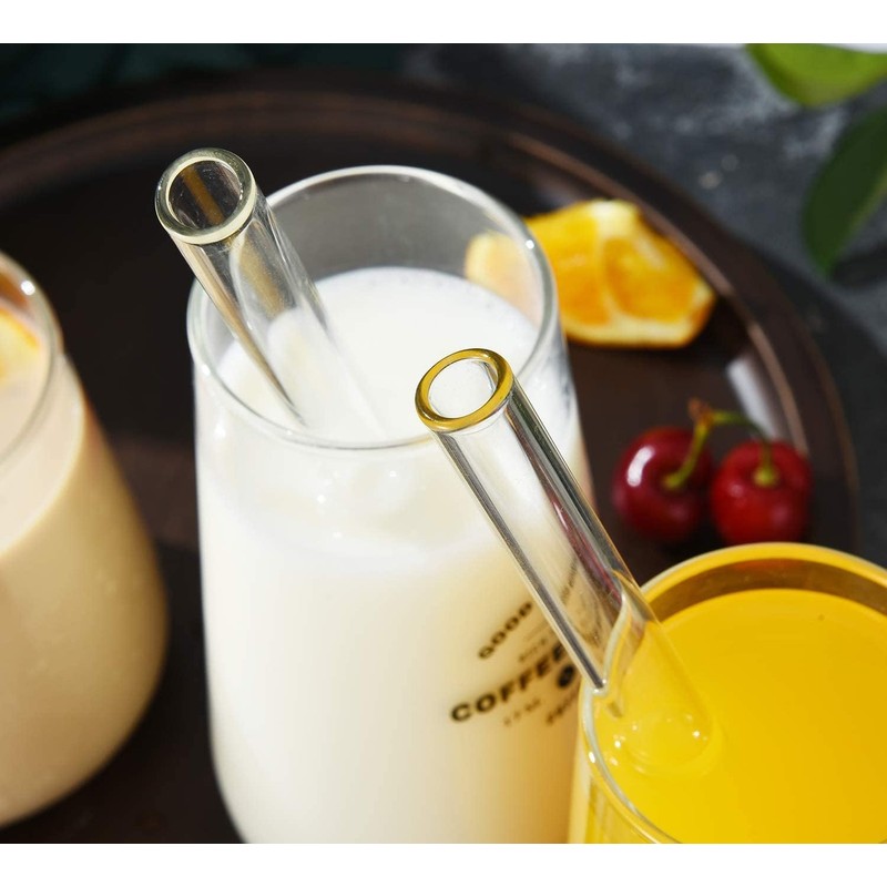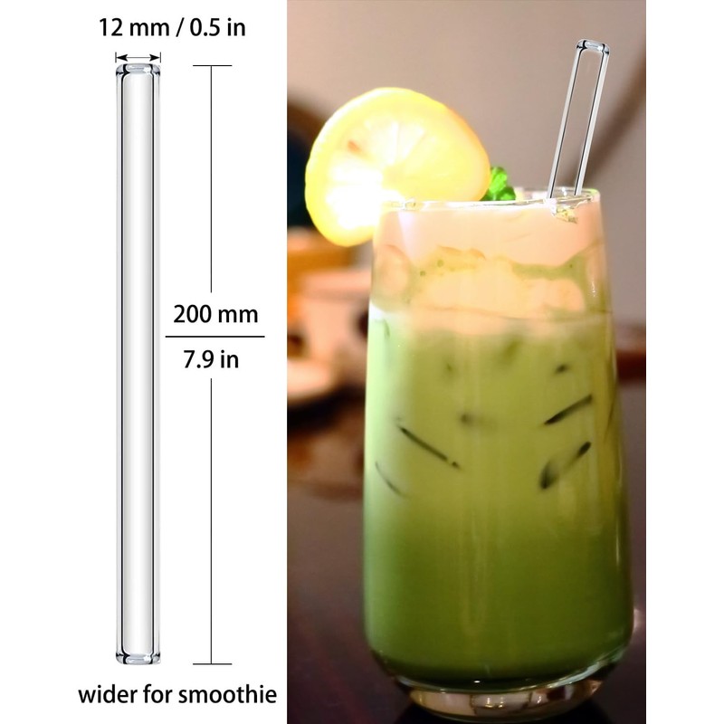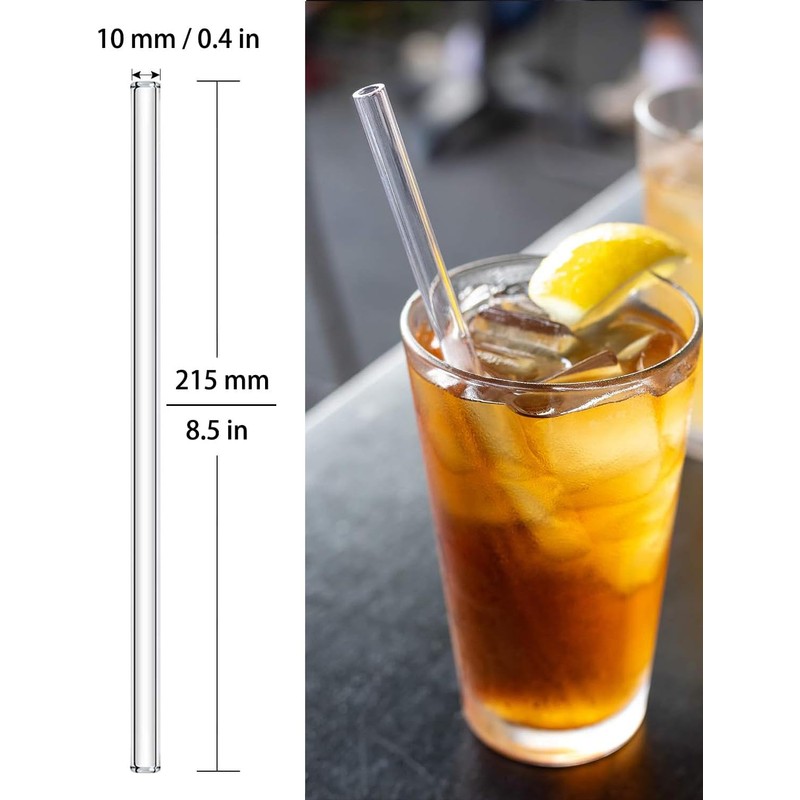 • REUSABLE DRINKING STRAWS SET: The package contains 10 glass straws and 2 cleaning brushes, including 4 straight straws & 4 bendy straws & 2 large straws. The straw has a length of 21.5CM and a diameter of 10MM. The longer size allows the product to be used in more containers. Regular calibre glass straws for plain drinks, 2 extra wider straws(20CM) for smoothies, bubble tea etc.