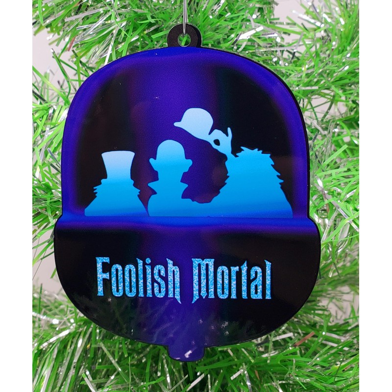 The Haunted Mansion Foolish Mortal Ornament is a spellbinding addition to any holiday decor, perfect for fans of the macabre and lovers of classic Disney attractions. Inspired by the iconic Haunted Mansion ride, this ornament captures the eerie charm and whimsical spookiness that has enchanted visitors for decades. Crafted with meticulous attention to detail, this ornament pays homage to the phrase "Foolish Mortal," a beloved greeting from the mansion's ghostly inhabitants. The ornament features a hauntingly beautiful design, reminiscent of the Victorian Gothic style of the Haunted Mansion. It is shaped like a classic tombstone, complete with weathered textures and intricate engravings that mimic the aged appearance of cemetery monuments. The words "Foolish Mortal" are prominently displayed in an elegant, eerie font, evoking the spooky yet playful tone of the ride. The tombstone is adorned with iconic elements from the attraction, such as skeletal hands, ghostly apparitions, and creeping vines that add depth and authenticity to the piece. Adding to its mystical allure, the ornament may incorporate subtle, glow-in-the-dark accents or a light-up feature that brings the design to life when the lights go down. This element enhances the ornament's presence, making it a standout piece on any Christmas tree or decorative display. The color palette is rich and moody, featuring deep purples, midnight blues, and ghostly whites, perfectly capturing the spectral ambiance of the Haunted Mansion. Crafted from high-quality resin or ceramic, the Haunted Mansion Foolish Mortal Ornament is designed to last, ensuring it remains a cherished part of your holiday traditions for years to come. The hand-painted details showcase the artistry involved in creating this unique piece, from the intricate lettering to the delicate ghostly figures. The sturdy construction and durable finish make it a reliable addition to your seasonal decorations. This ornament is a must-have for Disney enthusiasts, Haunted Mansion fans, or anyone who appreciates a touch of gothic elegance in their holiday decor. It serves as a delightful reminder of the magic and mystery of the Haunted Mansion, bringing a bit of its spooky charm into your home. Perfect as a gift or a personal keepsake, the Foolish Mortal Ornament invites you to embrace the whimsical side of the afterlife and celebrate the holiday season with a touch of spectral delight. In essence, the Haunted Mansion Foolish Mortal Ornament is more than just a decoration; it's a tribute to a beloved attraction and a celebration of the spooky, playful spirit of the Haunted Mansion. Whether hanging on your Christmas tree or displayed as part of a themed collection, this ornament is sure to enchant and delight all who see it.