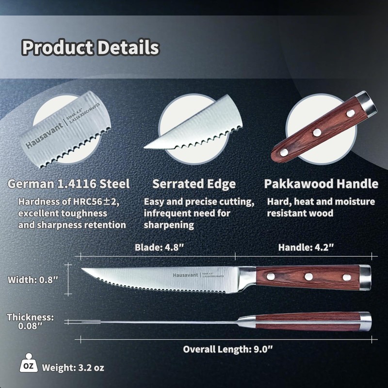 - 【One-piece Steel Full Tang Structure】Hausavant steak knife is forged from a single piece of steel, and features the Full Tang structure, the handle woods are triple riveted to the Tang. Knives made with this craftsmanship have excellent control, stability, strength, and durability.