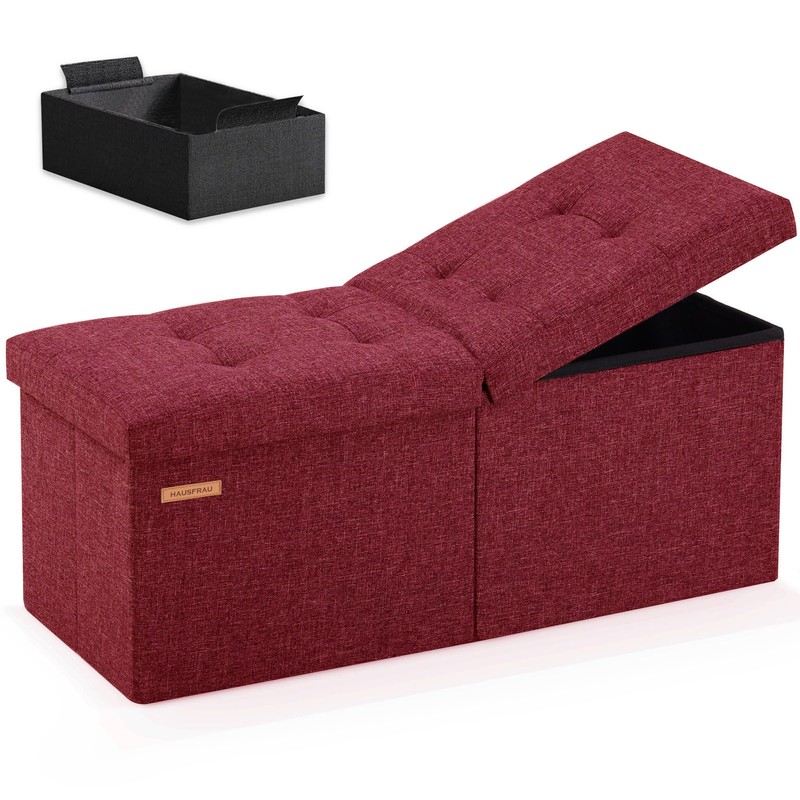 HAUSFRAU 31.5 Inches Ottoman with Storage Bench, Folding Ottoman Bench Small Foot Rest Stool, Bedroom Bench with Flipping Lid, Linen Bordeaux