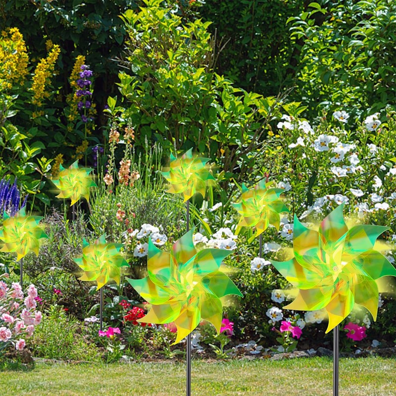 - 10 Pack Transparent Yellow Reflective Pinwheels: Our visual reflective ornamental pinwheel uses wind motion and light reflections to keep birds away coming from any angle. 10 pack shiny reflective Mylar pinwheels can rotate easily in the breeze, protect your garden, farm, and lawn by creating a bright flash that scares away birds