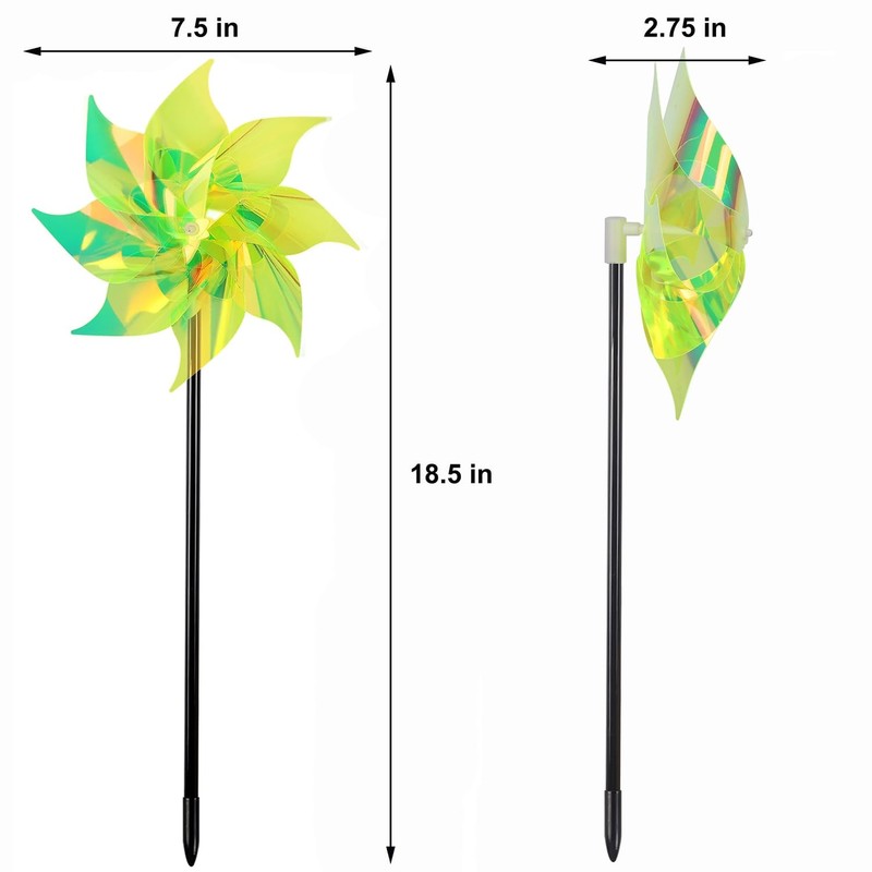 - Garden Decoration: Garden spinner pinwheel is 18.5 inches tall that enough to attract the attention of birds from a distance. They are so beautiful as they spin in the wind and reflect sunlight. These spinners work like any other holographic scare tape or scare rods, but they are also an elegant addition to your garden