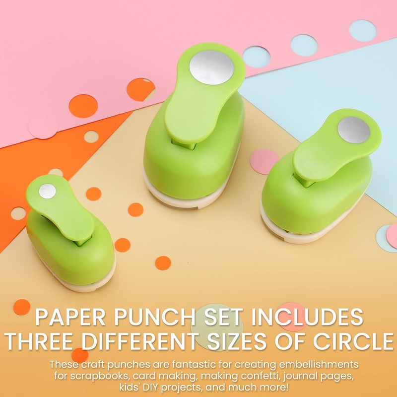 - THREE DIFFERENT SIZES IN ONE BUNDLE: Comes with three different sizes of circle punch, including 5/16 inch (10mm), 5/8 inch (16mm), and 1 inch (25mm). Multi-size circle paper punch combined packaging provides more possibilities and creativity, perfect for kids to develop their minds.