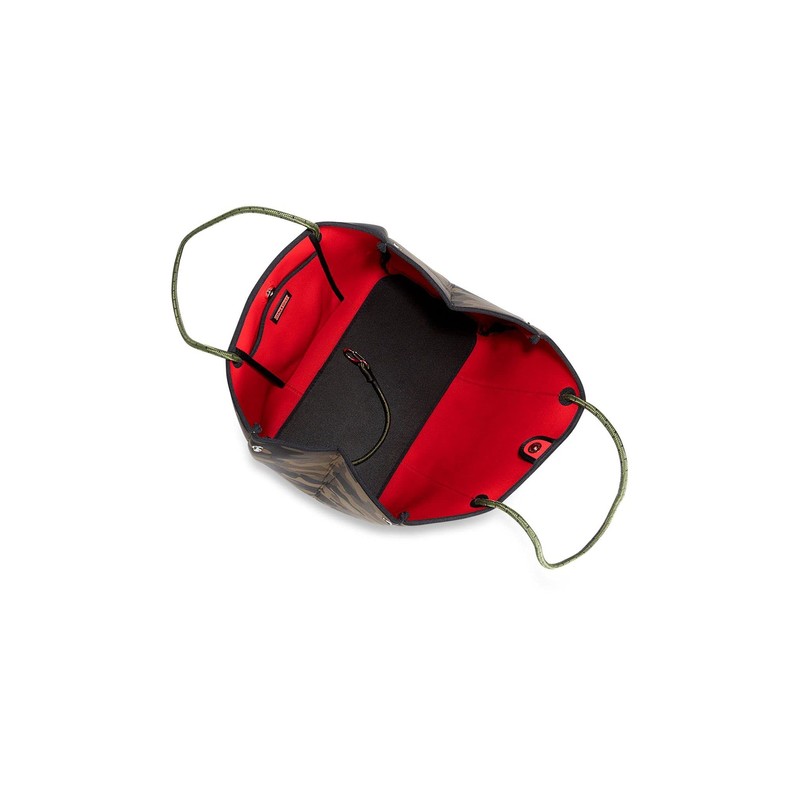 Haute Shore - Greyson Soho Neoprene Tote Bag w/Zipper Wristlet Inside, Green Camo W/Olive, Black, & Red Stripe