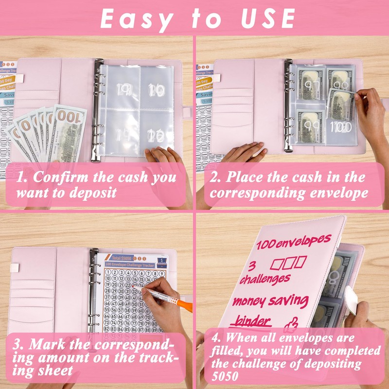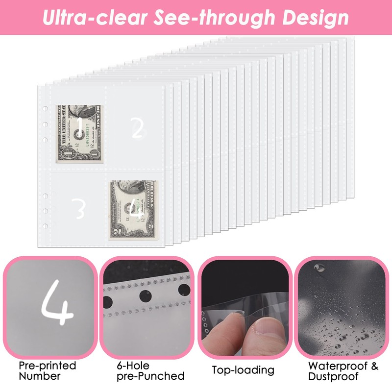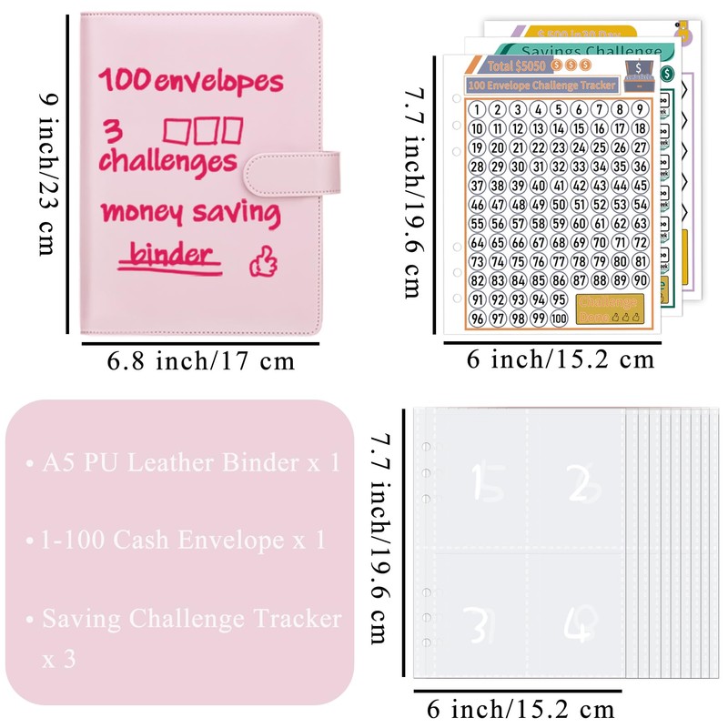 - Comprehensive Savings Challenge Set: Our savings binder system consists of a refillable A5 6-ring binder, 25pcs 6-hole transparent cash envelopes printed 1-100, 3pcs savings challenge tracker sheets; Portable money-saving binder is easy to carry around, fits into handbags and backpacks