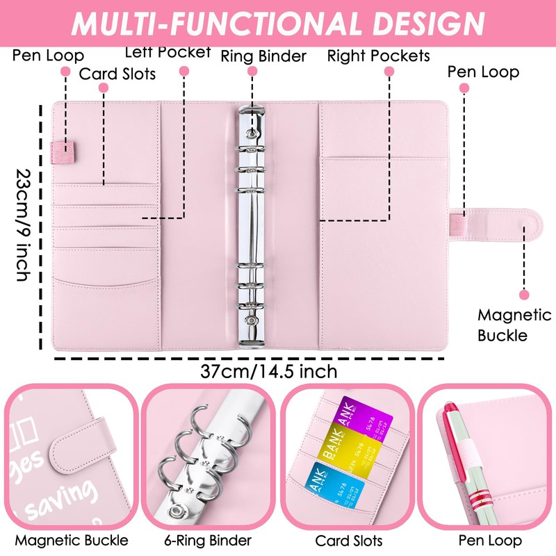 - Practical A5 6-Ring Binder: With magnetic button closure, ensure that your budget binder is not easy to open and the contents are protected. The interior is designed with card slots and cash slots to help you store bank cards, credit cards, bills, checks, cards, stamps, and other small items. The pen ring on the side keeps your pen secure and ready to use