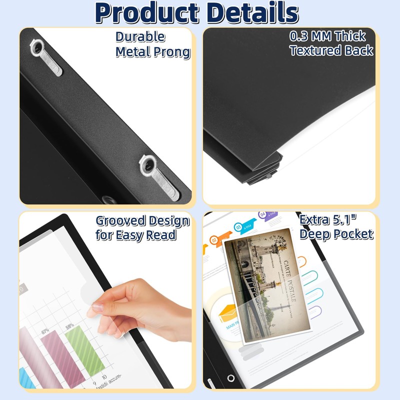 - 3 Metal Prongs: The report cover design with 3 hidden prongs that can easily and efficiently secure perforated documents in the folders and prevent loss