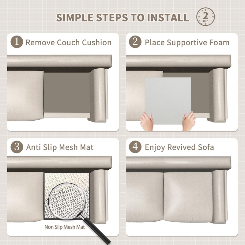 - [Easy to install] Simply insert the couch cushion support with CURVED SIDE UP between your sagging couch and frame, and you're done! And to make your purchase even more valuable, we've included an anti-slip cloth that ensures your couch cushion stays firmly in place.