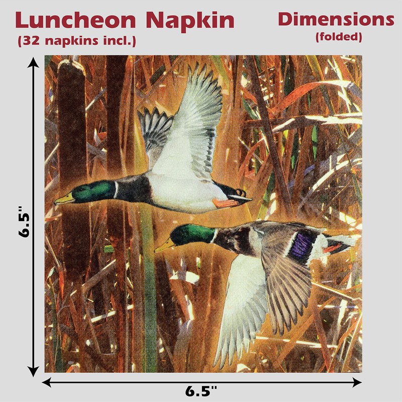 - 32 servilletas ideales: 6.5 pulgadas plegadas (13 x 13 pulgadas desplegadas), perfectas para entradas, picnics, postres, con bebidas y mucho más. Hermosos patos Mallard en vuelo.