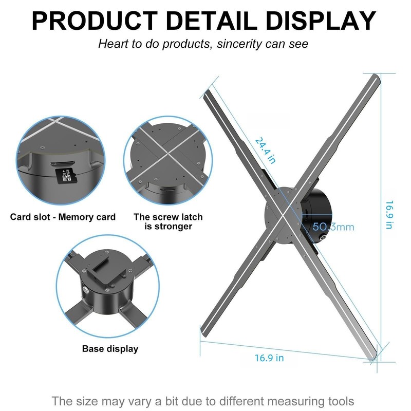 - Hardware Upgrade: Hologram fan four leaf design adopts high-speed brushless motor, the noise is reduced by 25% while the speed is increased; it is equipped with 722 densely arranged high-definition LED lamp beads + (2000*1444) high-definition resolution + High transmission speed (50-100M files only need 50-120s) + (2800cd lumens) High brightness LED lamp beads, restore the color of the video to the greatest extent, and the effect is real.