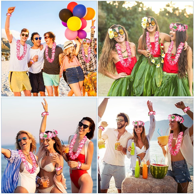 Hawaii Necklace Flowers, 4 Pieces Hawaiian Chain Headband and Bracelet Set Tropical Party Decorations Hawaiian Leis Chains for Hawaiian Party Decoration