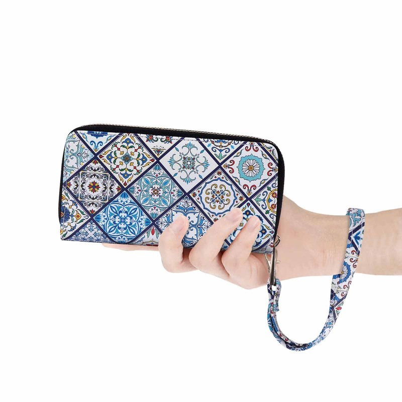 HAWEE Double Zipper Wallet for Woman Clutch Purse with Cell Phone Holder for Smart Phone/Card/Coin/Cash, Blue Check
