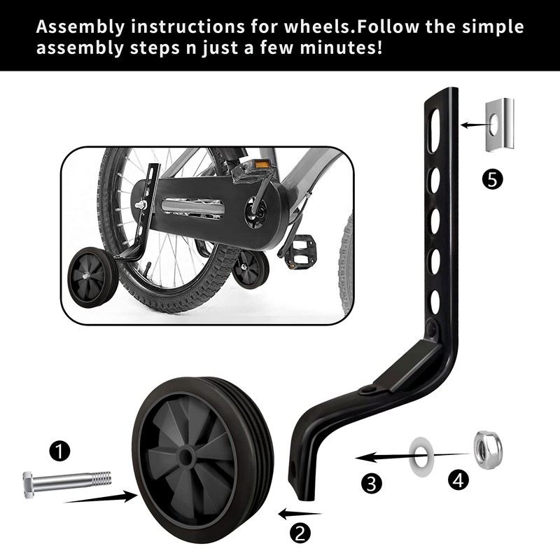 - 🚲 EASY TO INSTALL: We offer complete installation tools (2 x Bolts, 2 x Screw Washers, 2 x Locking Nuts, 2 x Limit Spacer, 1 x Wrench, 1 x Socket Wrench), so it's easy for you to quickly install the training wheel on your bike.