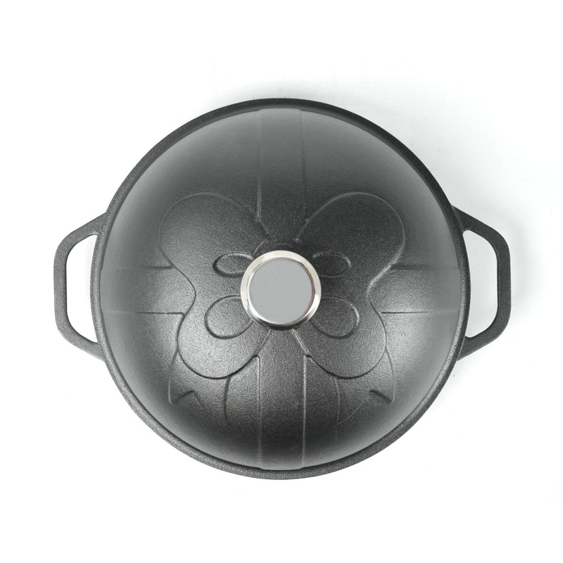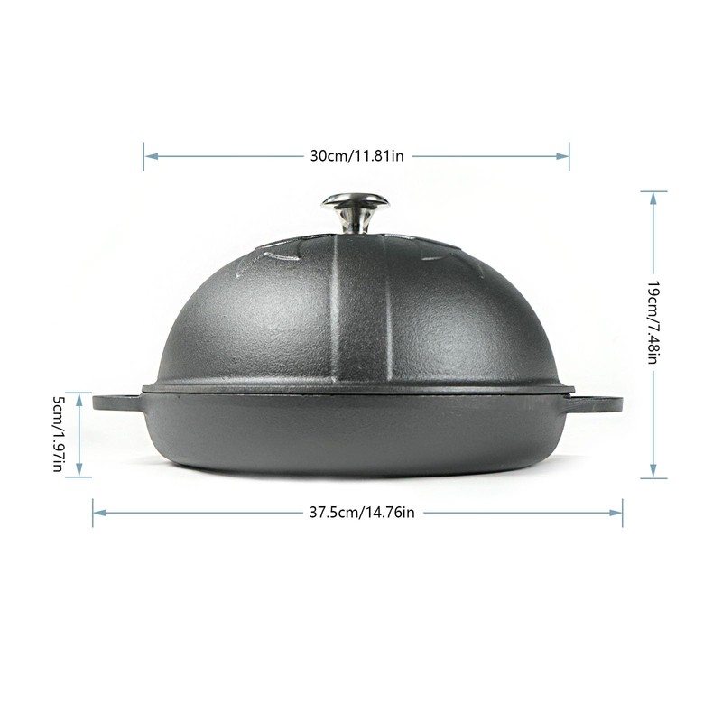 - Package included: 1pc cast iron dome lid with stainless steel knob(Height3.8inch/9.7cm)+1pc cast iron base(Base Depth 1.6inch/4.1cm) Size: Dia.11.8inch/30cm, Total Height 7.48inch/19cm.