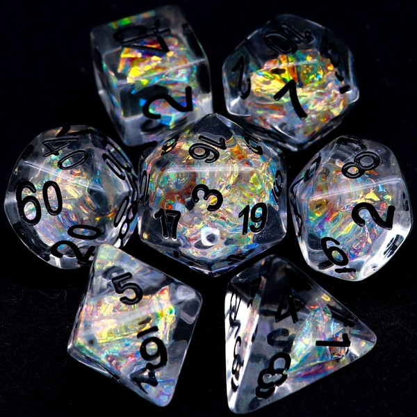Haxtec Clear DND Dice Set 7 Pieces Filled Resin Polyhedral D&D Dice W/Iridescent Rainbow Mylar Inclusion for Roleplaying Games Dungeons and Dragons Gift