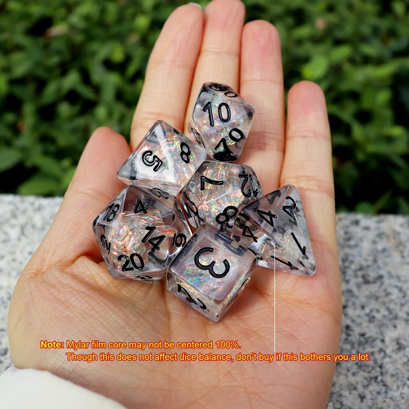 - Half Handmade Resin Dice: Environmental, non-toxic polyresin dice with colorful films trapped inside.