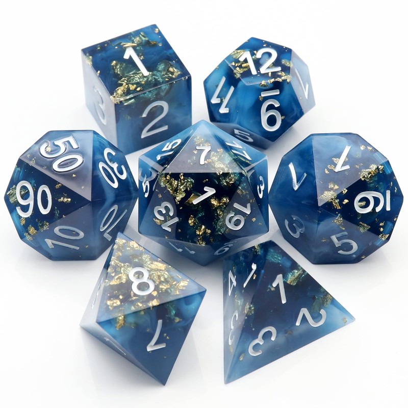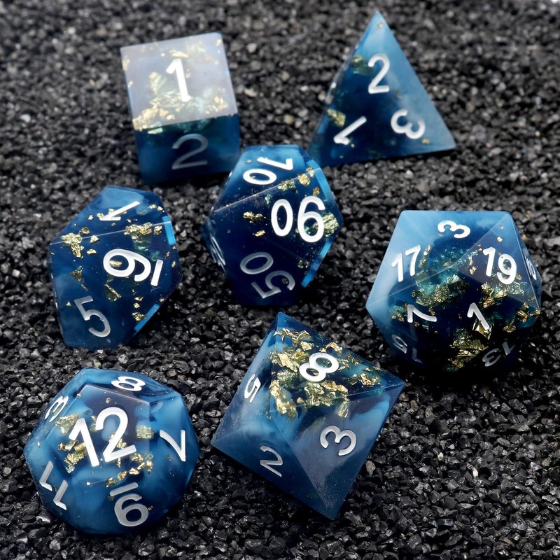 - Blue Sharp Edge Dice with Dice Case: Unique sharp edge dice with gold flakes.
