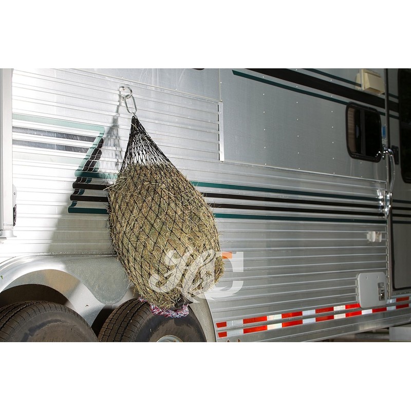 The Hay Chix® Half Bale Net (formerly known as 'Mini Net') attaches easily to a trailer, eye hook, fence or tree, it's perfect for keeping your feeding program on track while on the go. This net holds about 1/2 of a small square bale (4-6 flakes.)