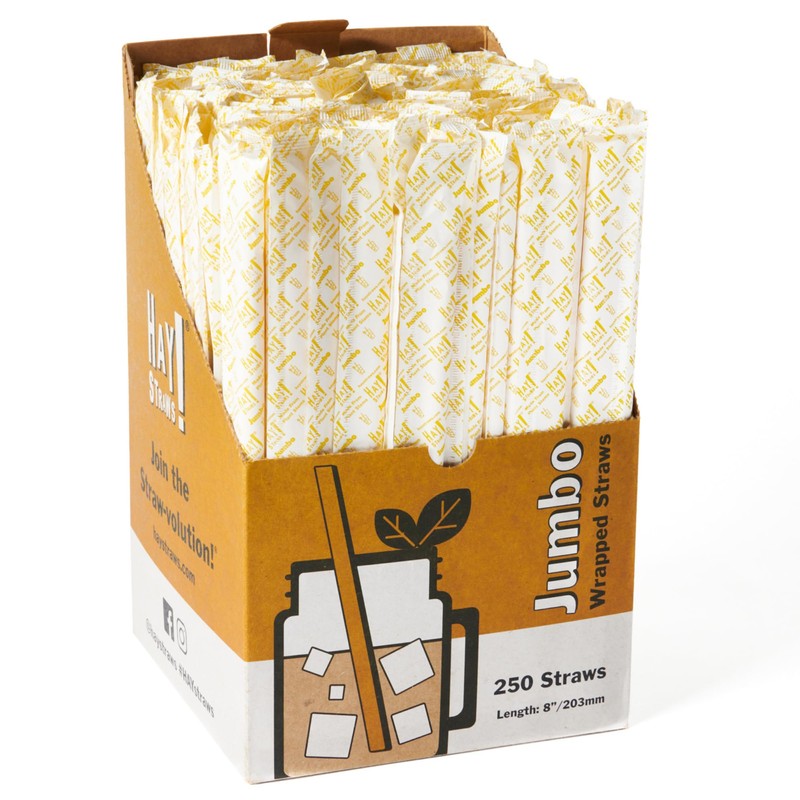 HAY! Straws | Wrapped Jumbo 8" Drinking Straw | 250 Count Bulk Straws | Individually Wrapped Straws | 5-7.5mm diameter | Reed Stem Straws |100% Plant-based | Certified Compostable Disposable Straws