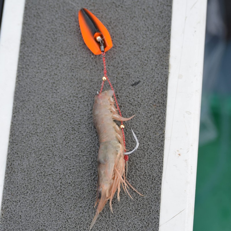 - ロングシャンクが海エビをしっかりホールドする小鯛鈎使用。