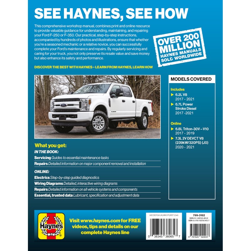 - This full color printed Haynes Repair Manual covers the Ford F-250/F-350 (Gasoline/Diesel) - 6.2L V8 (2017-2021), 6.7L Powerstroke (2017-2021) with the extra free online content covering 6.8L Triton - 30V-V10 (2017-2019) and 7.3L 2V DEVCT V8 (239kW/32OPS) (JO) (2020 - 2021)
