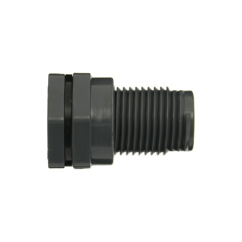'Sustain ideal pressure and flow in your pipelines with help from this bulkhead tank fitting by Hayward. This is a PVC bulkhead tank fitting. The temperature range is from 40 degrees to 140 degrees F. It fits a pipe size of 1". It comes in gray. The bulkhead tank fitting has a maximum pressure of 150 psi. The length is 3-57/64" long. The body is made of PVC material.'