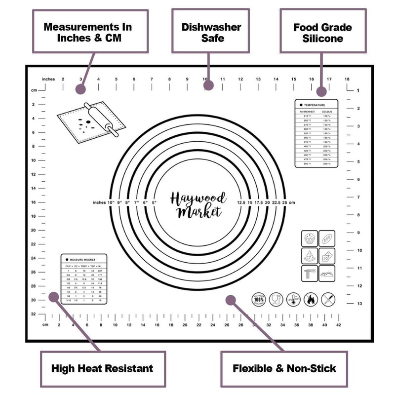 **Make fondant icing, pie or pizza crusts, cookies, and more with the Haywood Market baking pastry mat!** Whether you are a seasoned pastry chef or have just the discovered the joys of baking, this pastry mat is what you need! You can gift it to your friends and loved ones so that they can also enjoy freshly baked items. So, go ahead and get our amazing product to start baking with perfection and enjoy it with your loved ones.