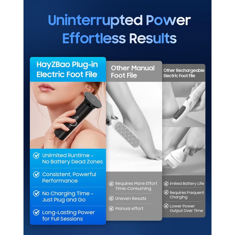 - Adapter-Powered Design: No Batteries Required,Plug into an outlet for immediate use.Unlike cordless or rechargeable foot file, this type requires a constant power supply, making it suitable for extended usage without worrying about battery life.