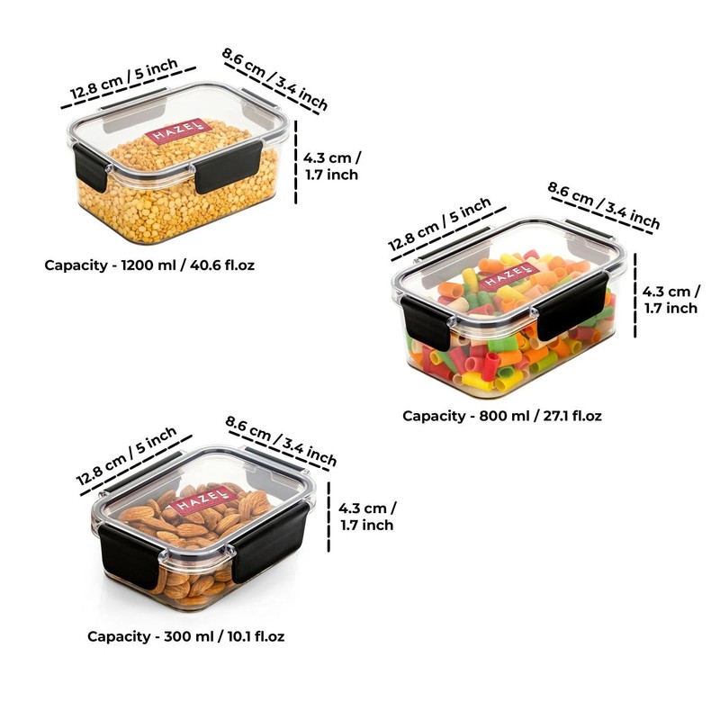 • 300 ML Container Dimension : 12.8 x 8.6 x 4.3 cm (LxBxH), Weight : 144 grams, Capacity : 300 ML. 800 ML Container Dimension : 15.8 x 10.3 x 6.5 cm (LxBxH), Weight : 205 grams, Capacity : 800 ML. 1200 ML Container Dimension : 17.4 x 11.8 x 7 cm (LxBxH), Weight : 243 grams, Capacity : 1200 ML.