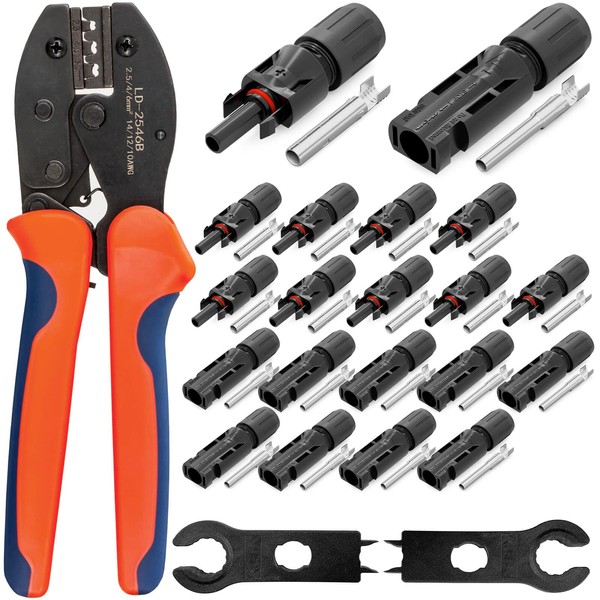 - Solar mounting set: solar plug pair (plug and socket) 1000 V compatible with solar panel + crimping tool, solar contact terminal with cross section diameter 2.5 / 4 / 6 mm² and wrench for 1000 V and 1500 V PV plug