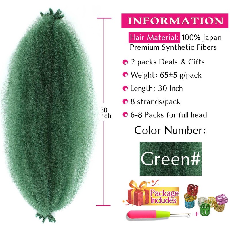 Hbegant Extensiones De Cabello Afro Twist De 76 Cm (2 Paquetes), Elásticas, Preesponjadas, Preestiradas Y Enrolladas Para Rastas Suaves (76 Cm (Paquete De 2), Verde)