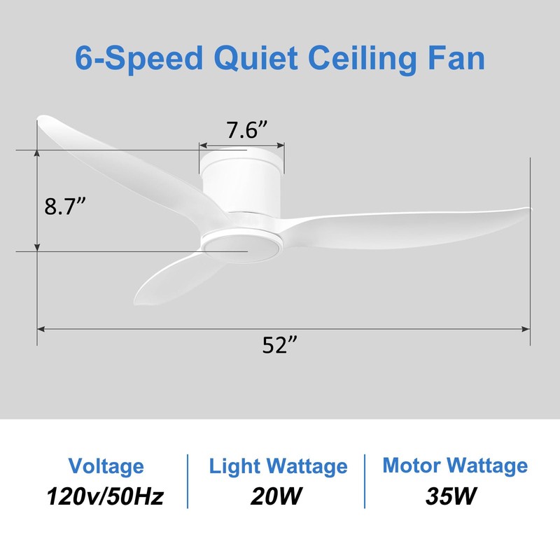 Hbinzar 52 Inch Ceiling Fan with Light and Remote, Indoor Low Profile Flush Mount White Ceiling Fan with Dimmable Light, Reversible Motor for Bedroom, Living Room