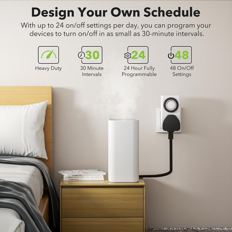• Energy Saving - You can set your own schedule for when to activate or deactivate the devices. Settings will repeat daily once programmed. This timer switch will turn on/off automatically so it won't remain on when unused
