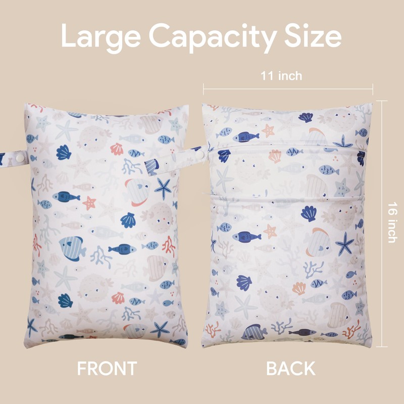 - Set of 2 wet bags - Large storage bag (40 x 28 cm) has 2 zips and 2 compartments for separating dirty and clean nappies or other wet items, can hold about 8-10 nappies.