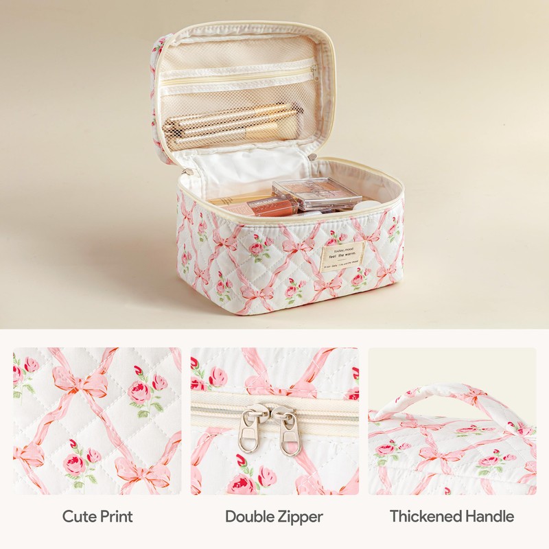 - HIGH-QUALITY MATERIAL - This quilted makeup bag is made of cotton material, which is easy to clean, and has been well-stitched and reinforced at all stress points. The double zipper is made of high-quality gold-plated alloy, which can make the makeup bag easier to pull and align neatly.