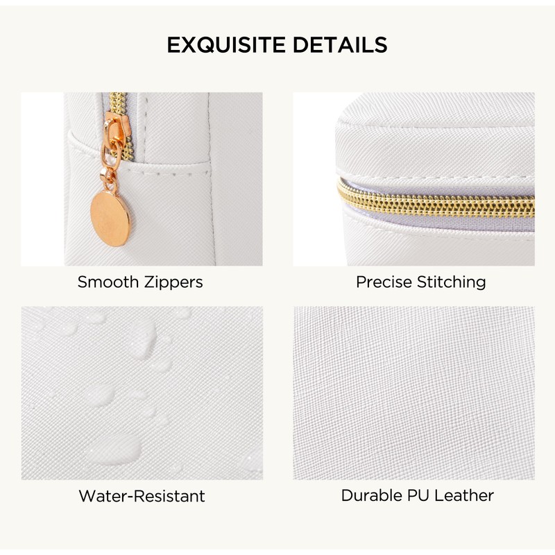 - Vegan Leather with Gold Zipper: This makeup bag is made of water-resistant and eco-friendly vegan leather, protecting your cosmetics from water damage while also contributing to sustainable fashion. The bag is accented with a stylish gold zipper, adding a touch of elegance to its design.