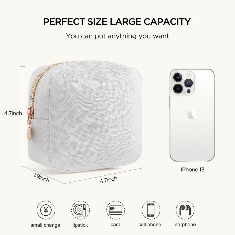 - Mini but Mighty – The mini makeup bag measures 4.7'' X 4.7'' x 2''(12cm x 12cm x 5cm), perfect for holding daily mini essentials including lip balms, hair ties, jewelry, Air Pods, charging cords and medications. Slip it into your purse, backpack, everyday tote or travelling bag for easy access to your must-have items.