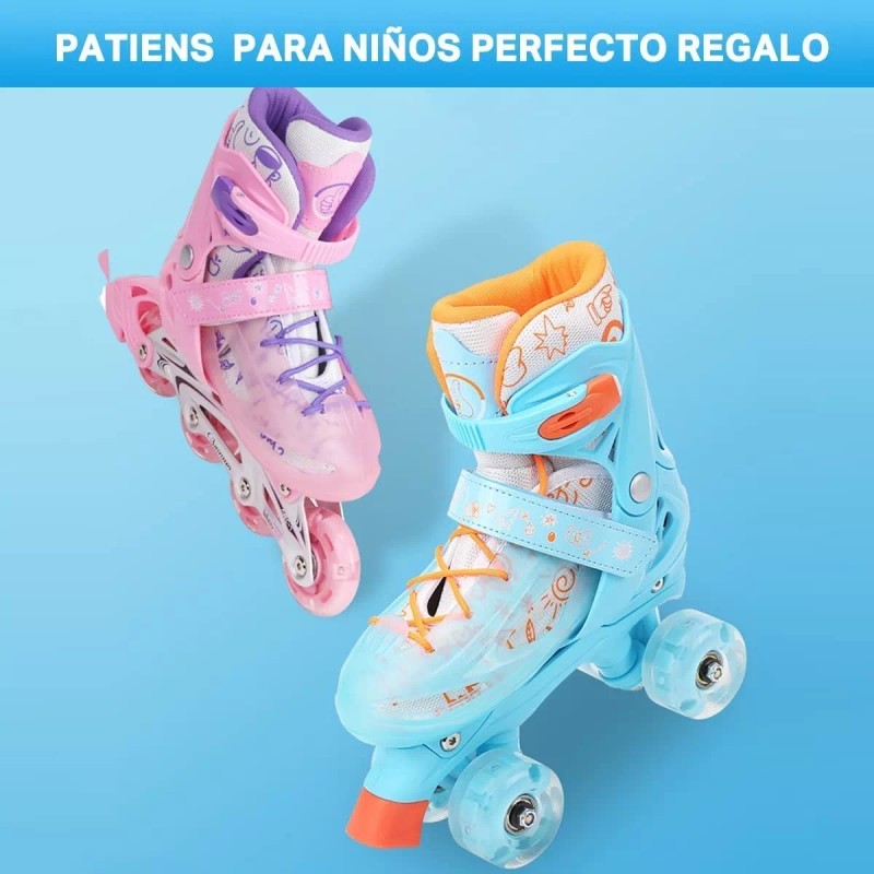 Tenemos patines en línea y en paralelo, color en azul y rosa respectivamente, todos son ajustables, si está interesado en ellos, haga clic en la imagen correspondiente para navegar.