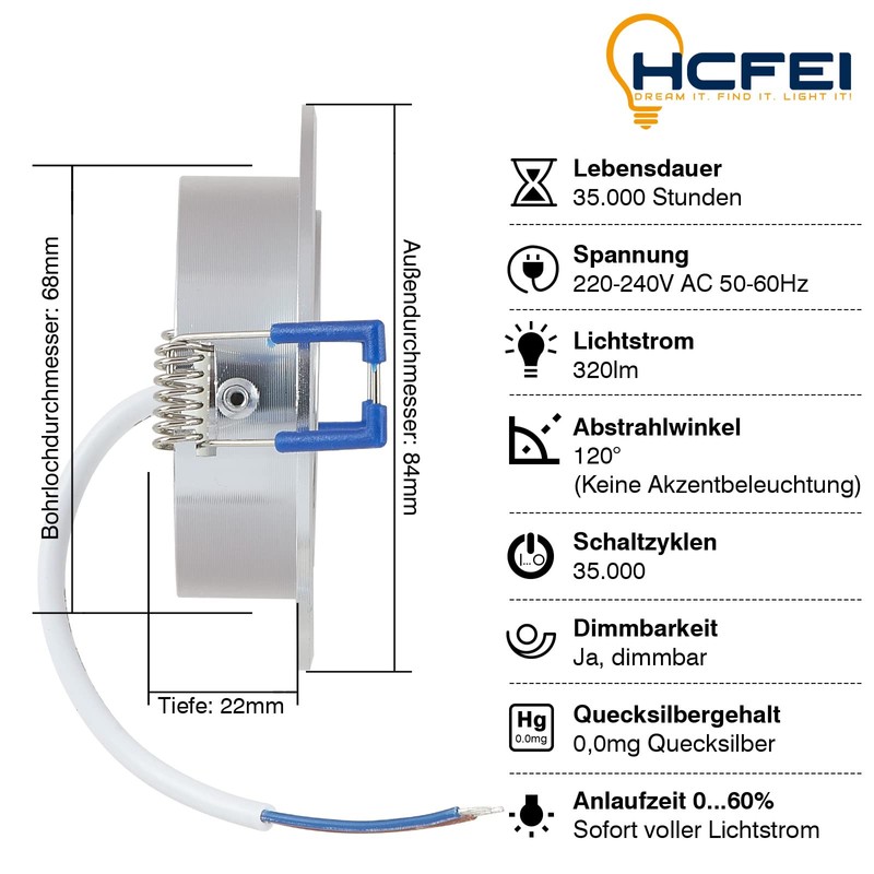 - Dimensions – hole diameter 68-75 mm, outer diameter: 83 mm, installation depth (including LED module): 25 mm