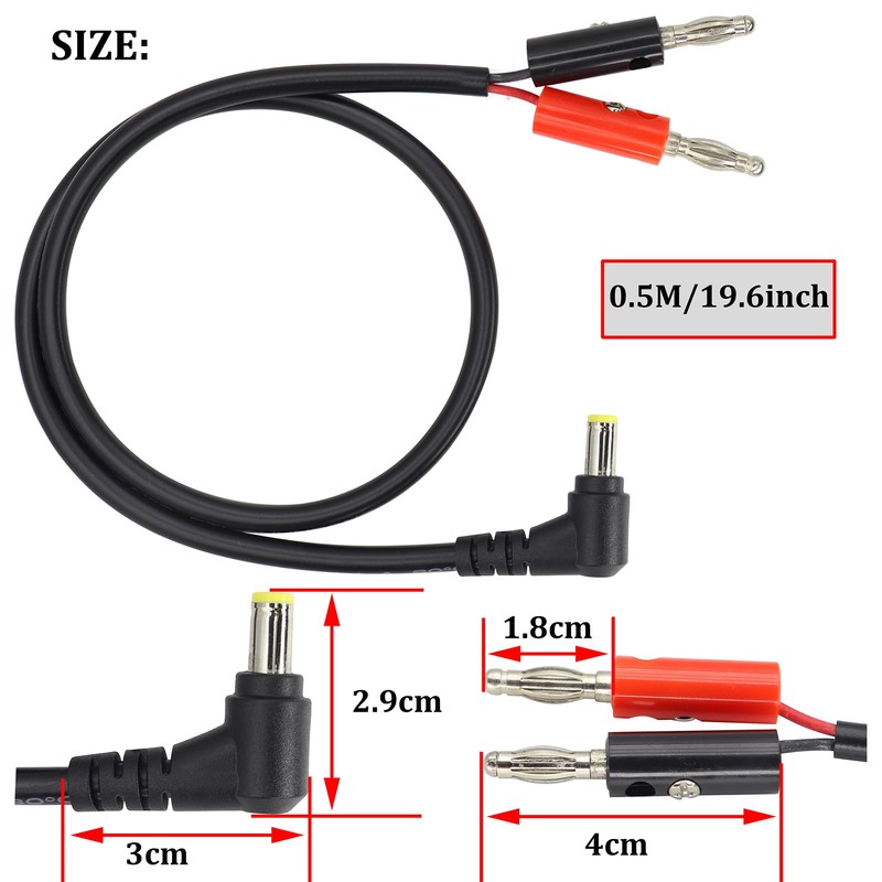 - [Main parameter]:Connector: Nickel plating Pure copper 4mm banana plug and DC 5.5mm x 2.5mm male. The 4mm Banana Plug to DC 5.5mm x 2.5mm male cable Voltage: 12-24V. Current: 0-10A. The total power does not exceed 120W. Wire gauge: 18AWG. Total Length: 50 cm/1.6ft, ,red positive pole, black negative pole, easy to operate. conductive material: copper.