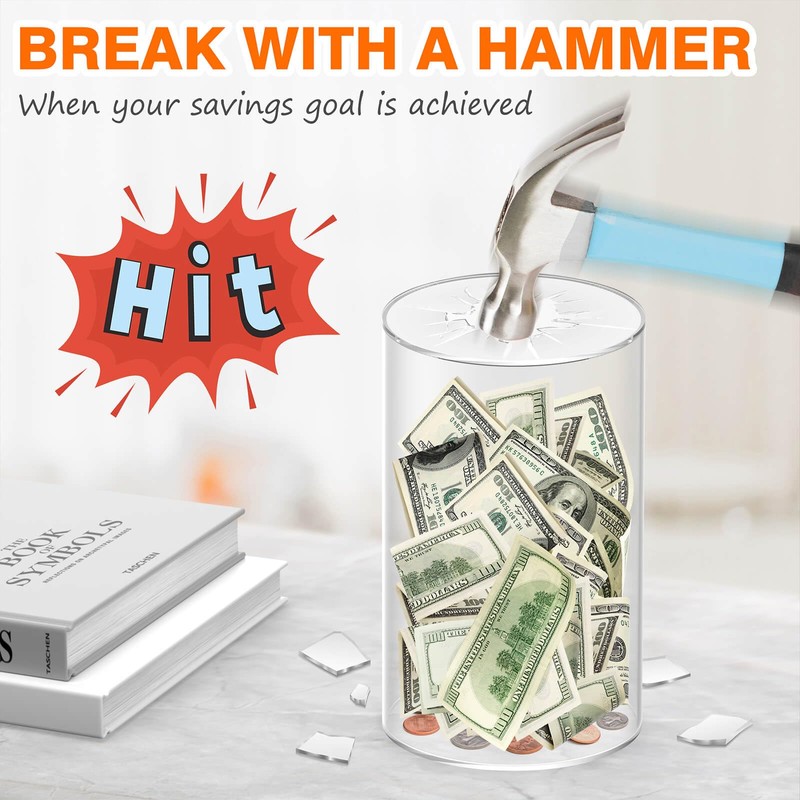 • Must Break Open: To withdraw money from this savings jar that only accepts deposits, you need to smash it open with a hammer. It is advisable to only open it when you have reached your savings goal or in emergency situations, as the acrylic transparent savings jar, once opened, will be destroyed