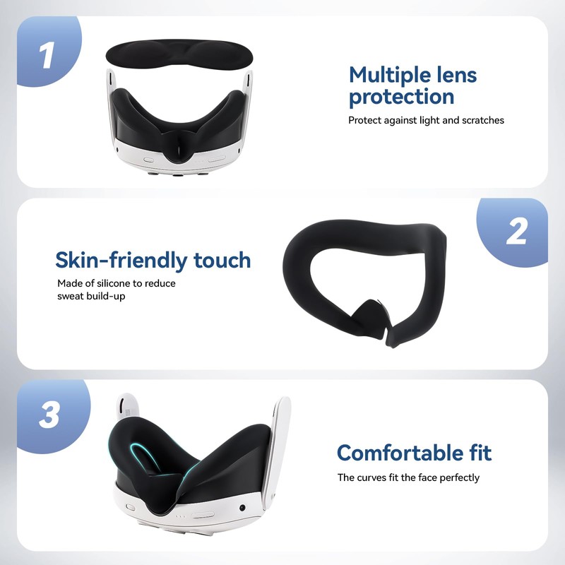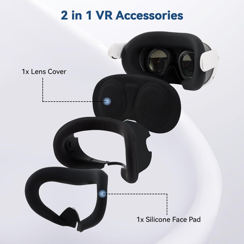 - Silicone Cover Set:1x VR Silicone Face Cover,1x VR Headset Shell Cover,2x Controller Grips Cover, 2x Controller Shakes Stick Cap,1x Lens Cover,Provide Comprehensive protection for your VR