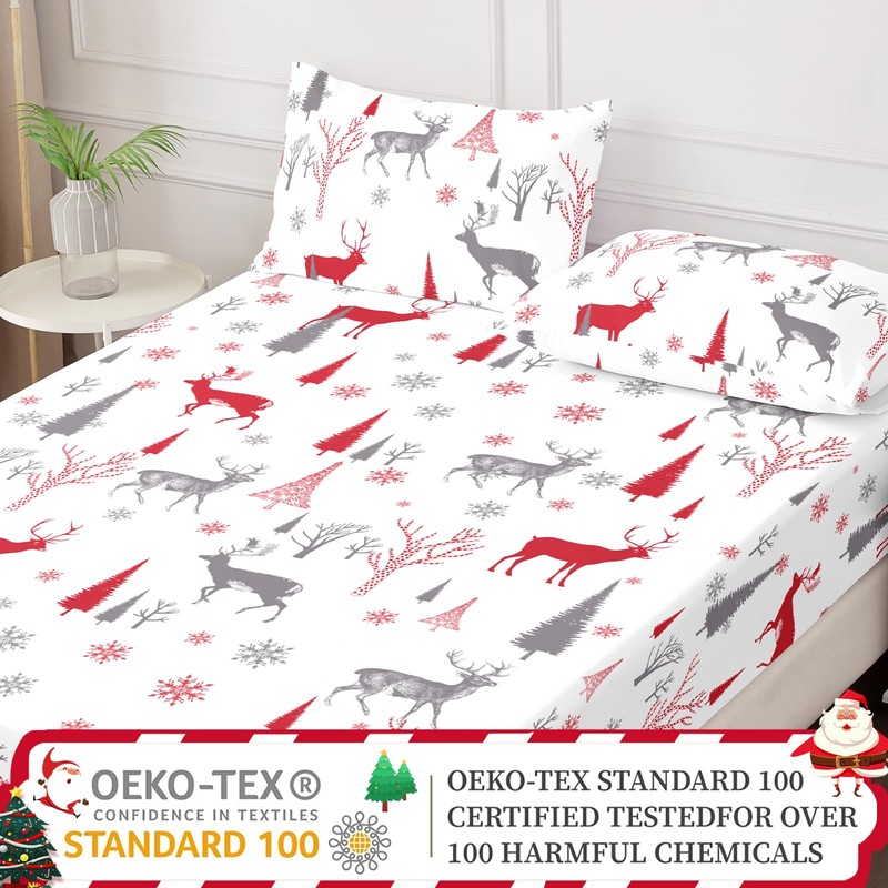 HCORA Christmas Twin Fitted Sheet and Pillowcase Set - 100% Brushed Microfiber Reindeer Fitted Sheet Deep Pocket Up to 16" - Ultra Soft, Shrinkage & Fade Resistant (Twin)