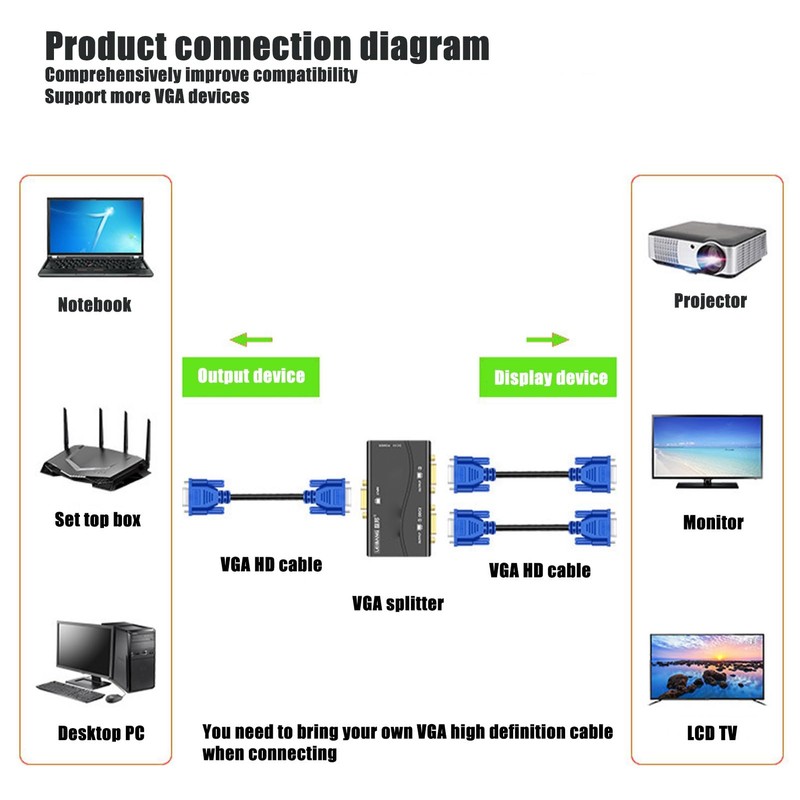 - Drive : VGA splitter built in chip, plug and play, no driver, 250MHz bandwidth, to ensure stable of the device, convenient and quick to use.